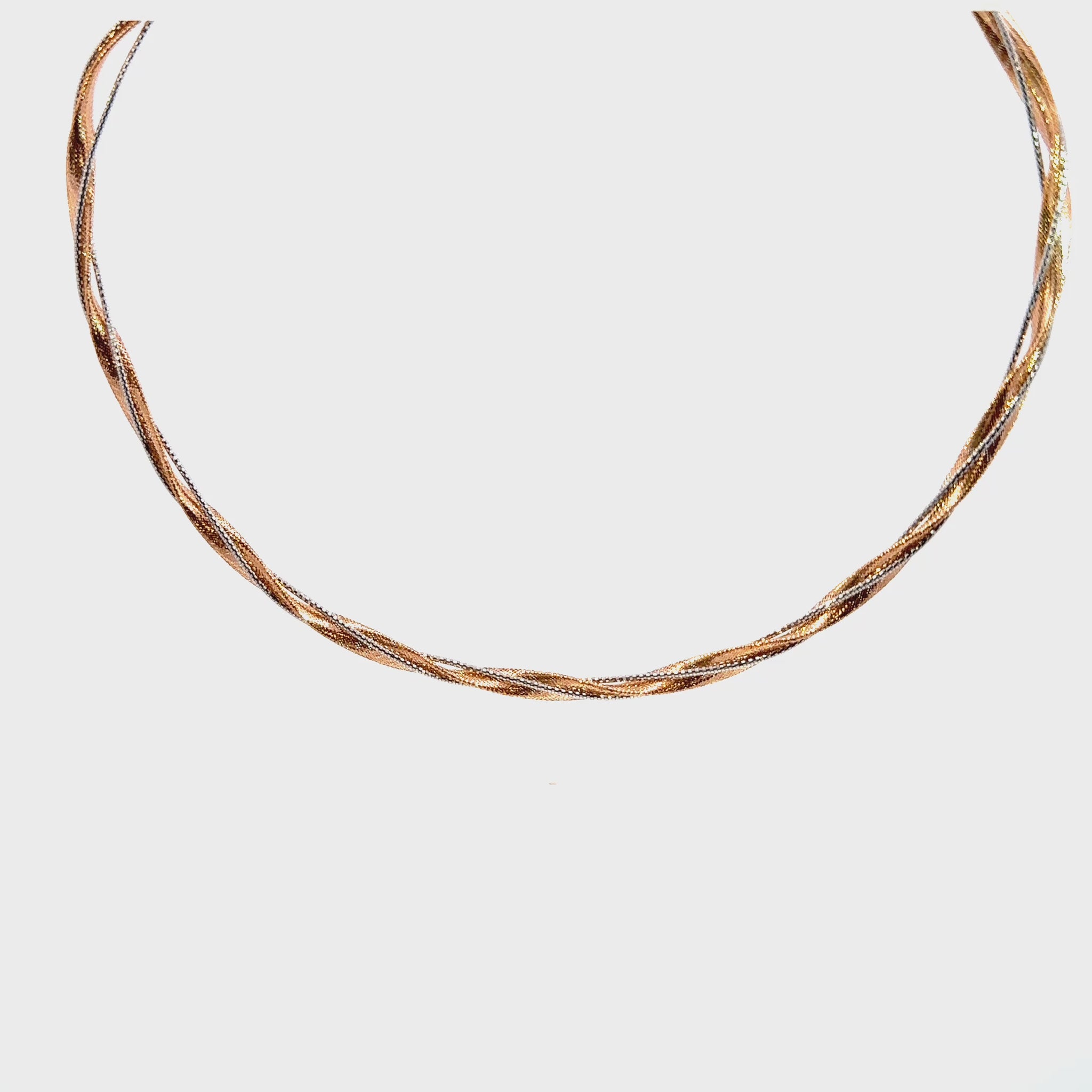 Crafted from 11.71 grams of pure 18K gold, this elegant tri-color necklace features an intricate twisted design blending rose And white gold. Its lightweight yet luxurious feel makes it ideal for both daily wear and special occasions, adding a subtle statement of sophistication to any look.