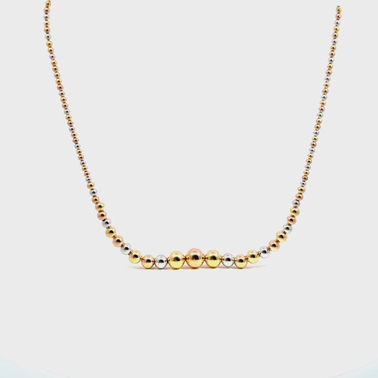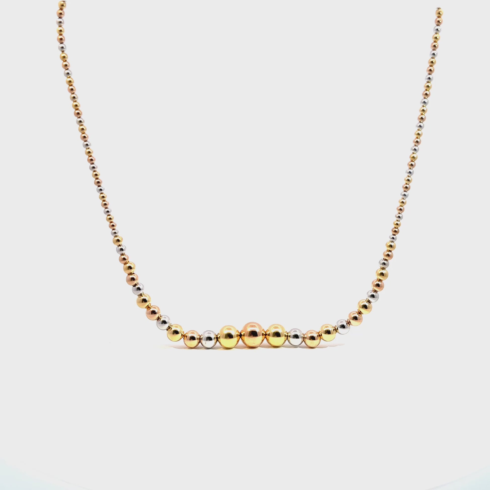 Crafted from 7.91 grams of 18K gold, this elegant necklace features alternating yellow and white gold beads, with a graceful center cluster that adds charm and balance. A versatile piece that transitions effortlessly from day to night.