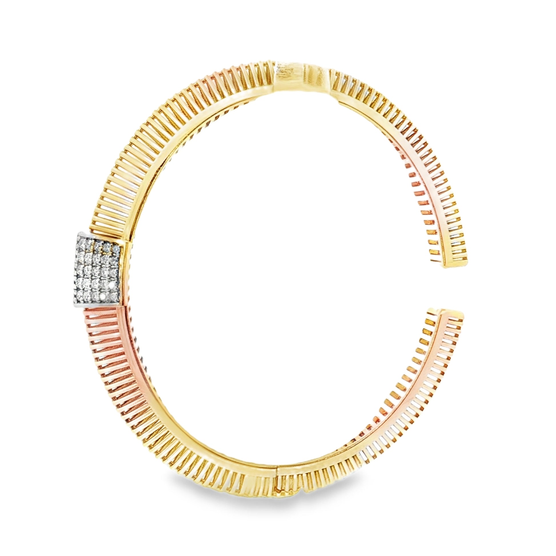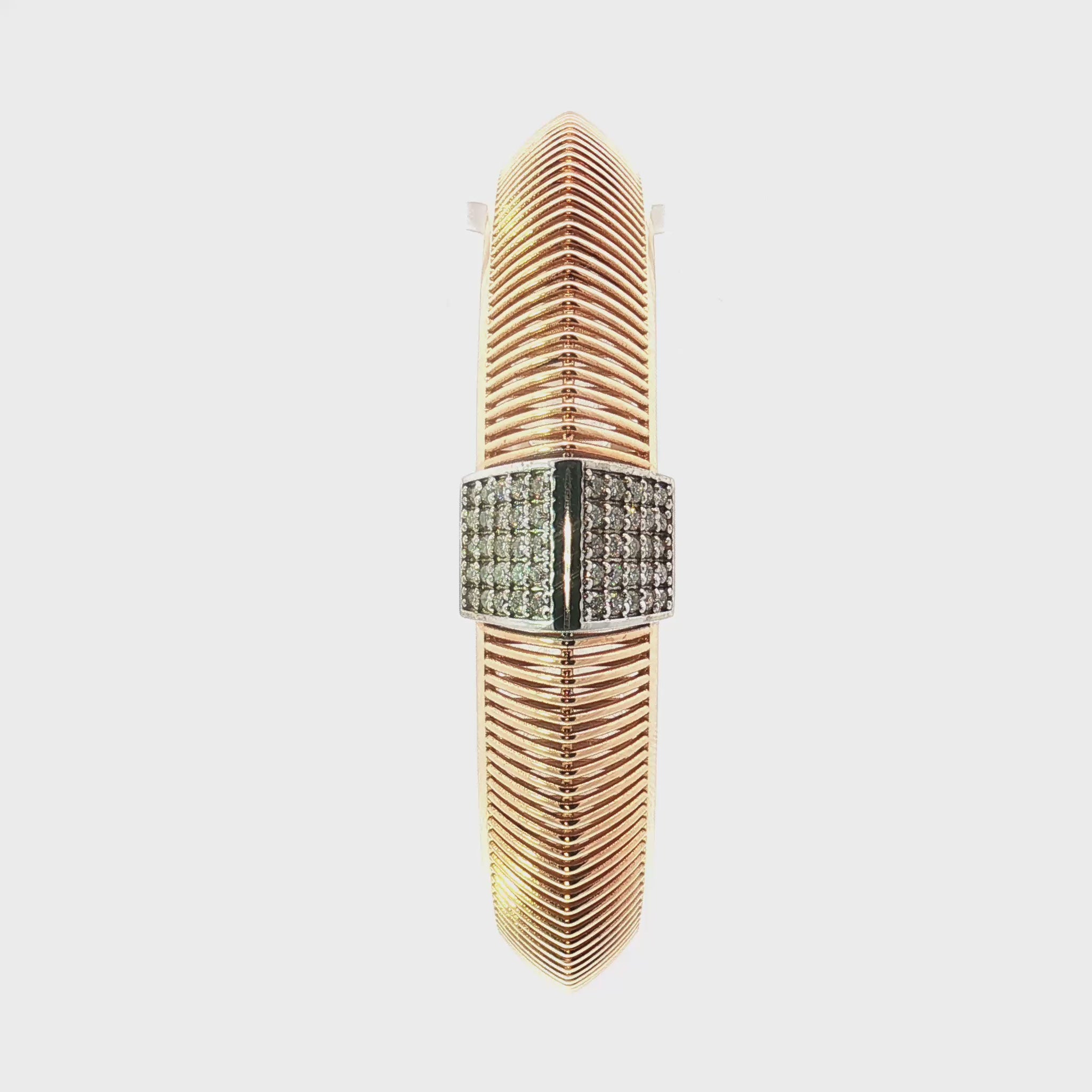This exceptional cuff bracelet is crafted from 35.98 grams of 18k gold, showcasing a bold ribbed design with a striking pavé of round brilliant diamonds at its center. A timeless statement of elegance and luxury, designed to captivate with its brilliance and refined style.