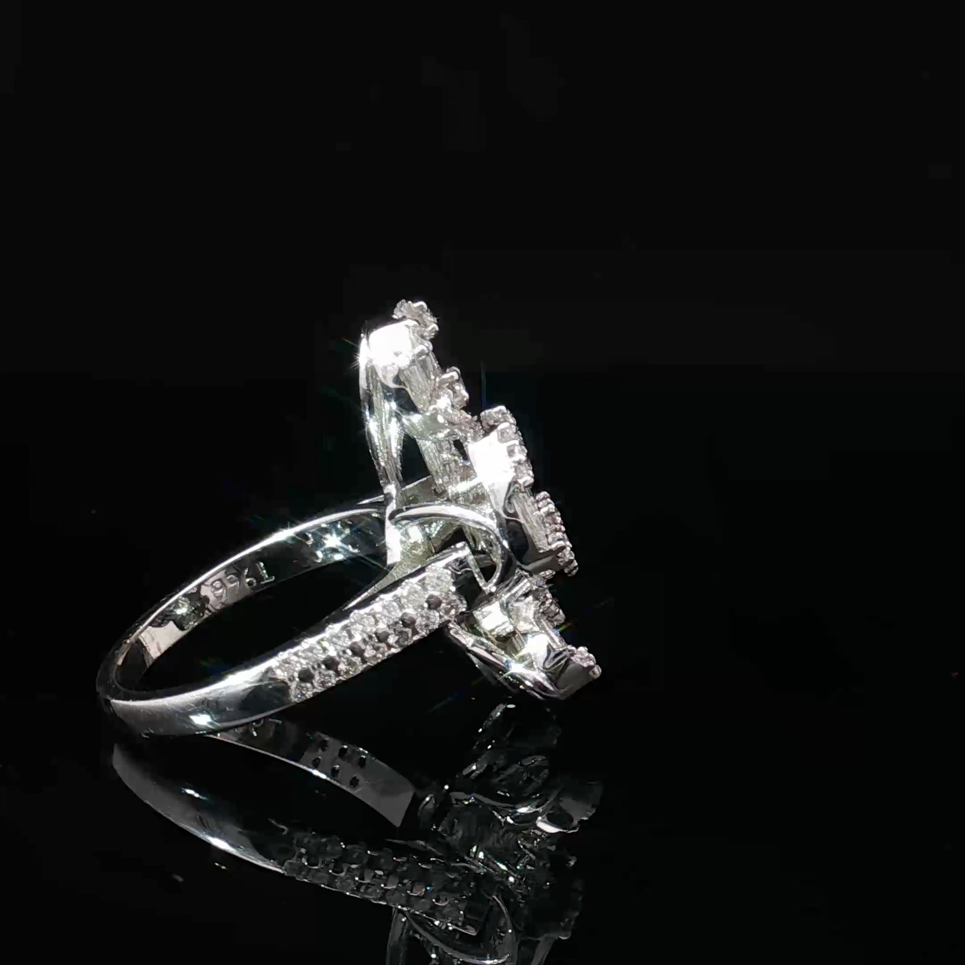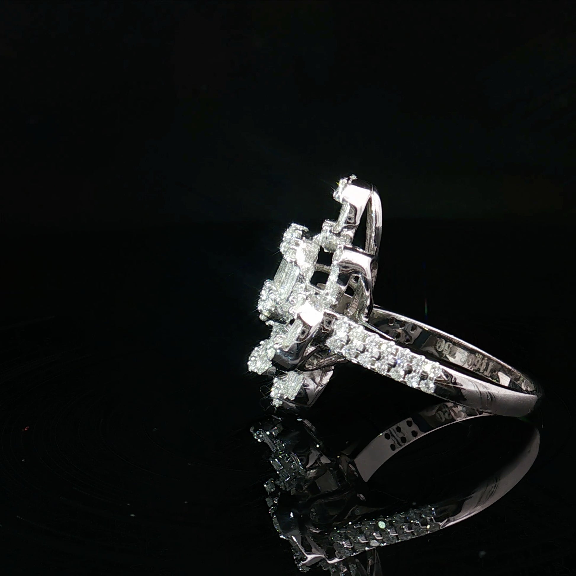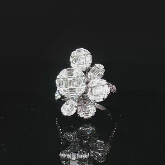 Crafted in luxurious 18k white gold, this magnificent ring features a dazzling harmony of round and baguette-cut diamonds. The interplay of brilliance and geometry creates a captivating design that radiates elegance from every angle. A true statement of sophistication, this piece embodies both timeless beauty and modern refinement.