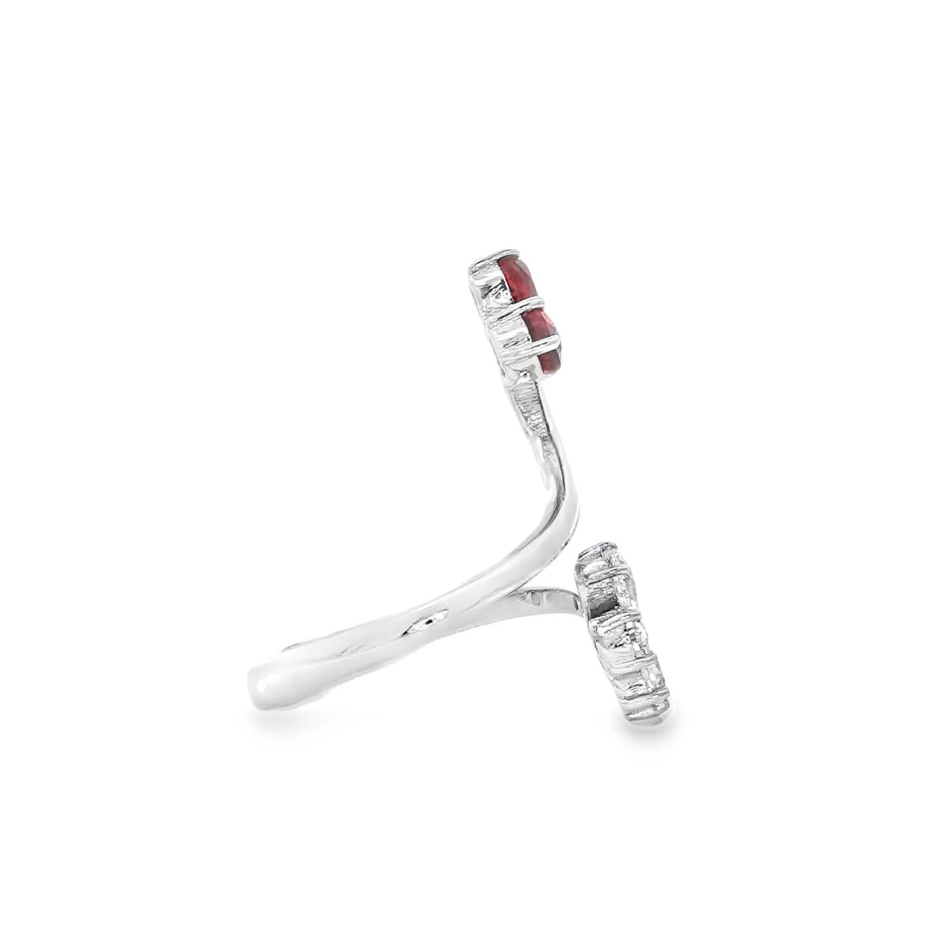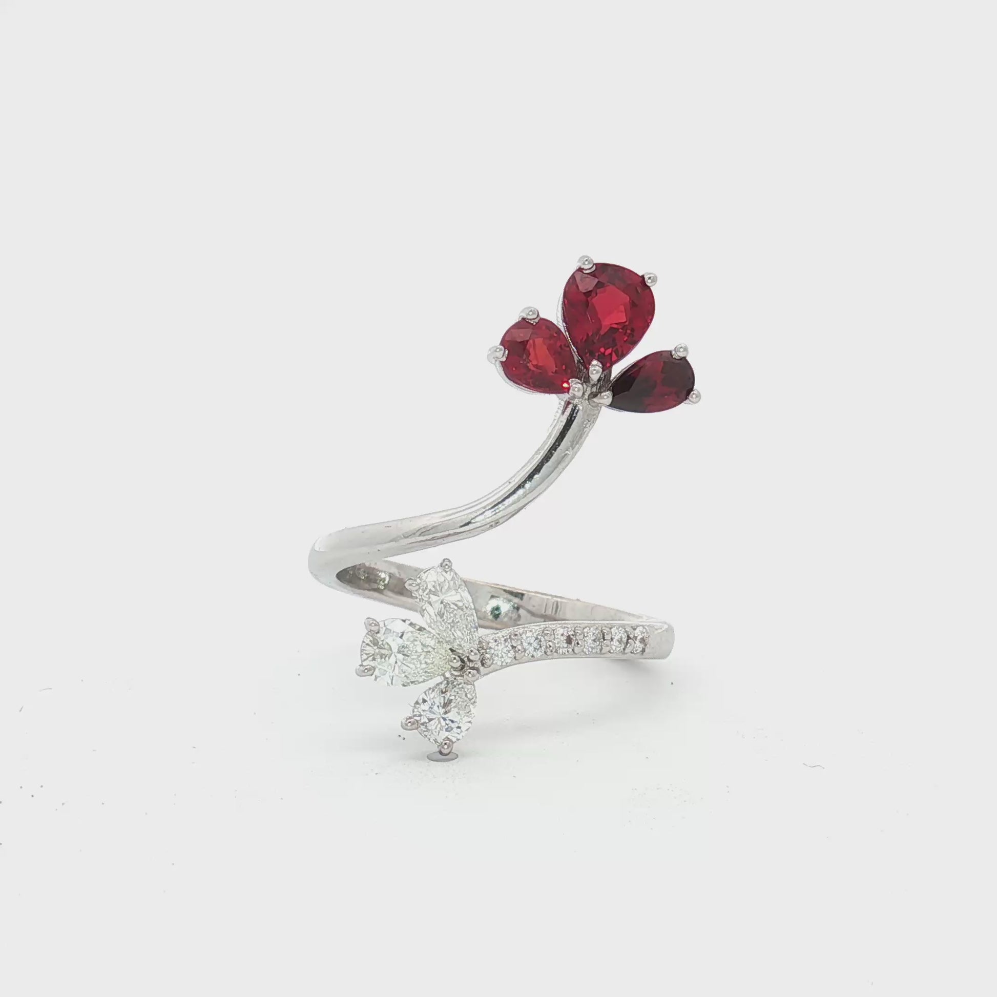 Crafted in 18k white gold, this delicate open-design ring features a vibrant 1.33 carat Songea ruby accented with pear and round brilliant diamonds. The unique floral-inspired arrangement radiates feminine elegance, blending fiery red hues with timeless diamond brilliance. A refined statement piece symbolizing passion and grace.
