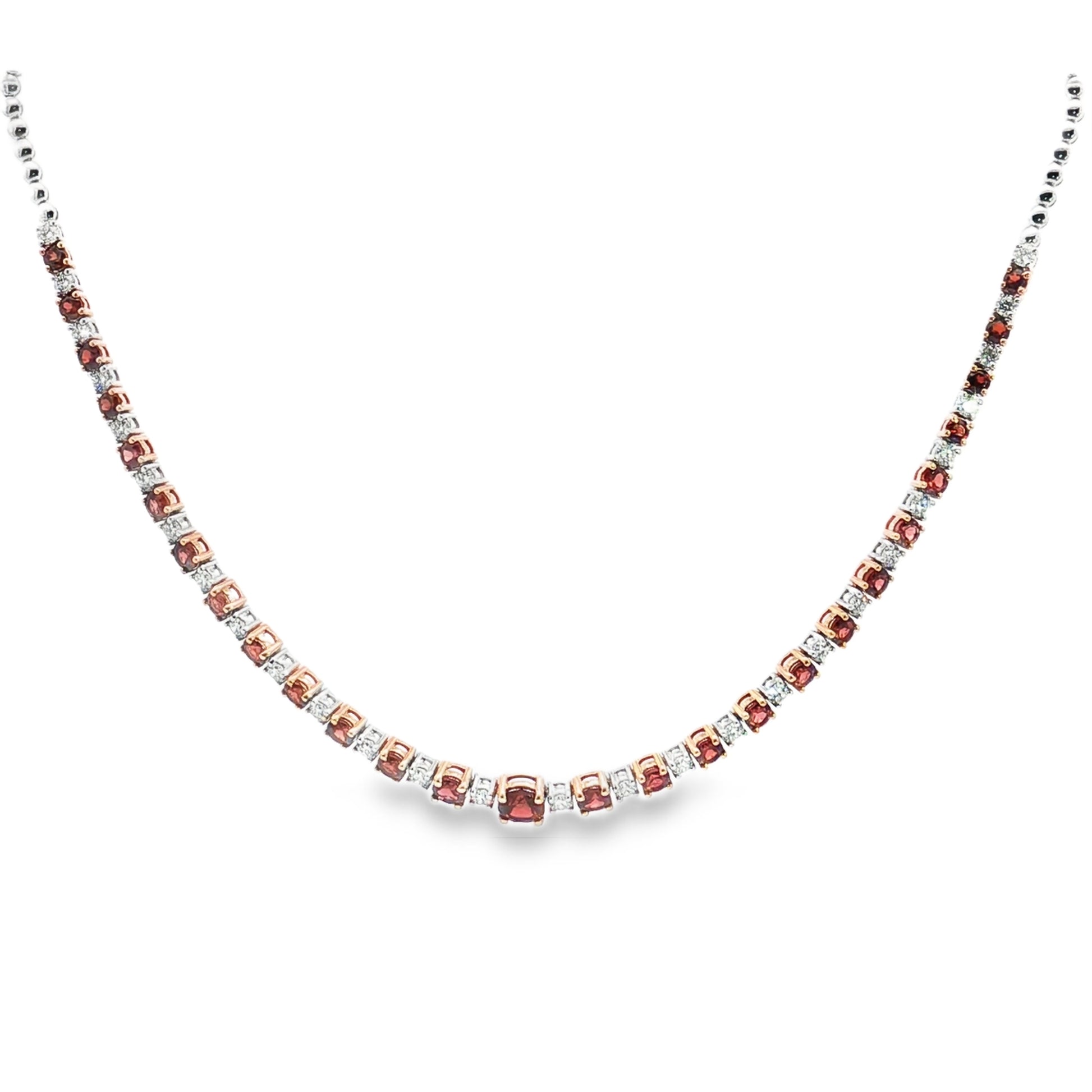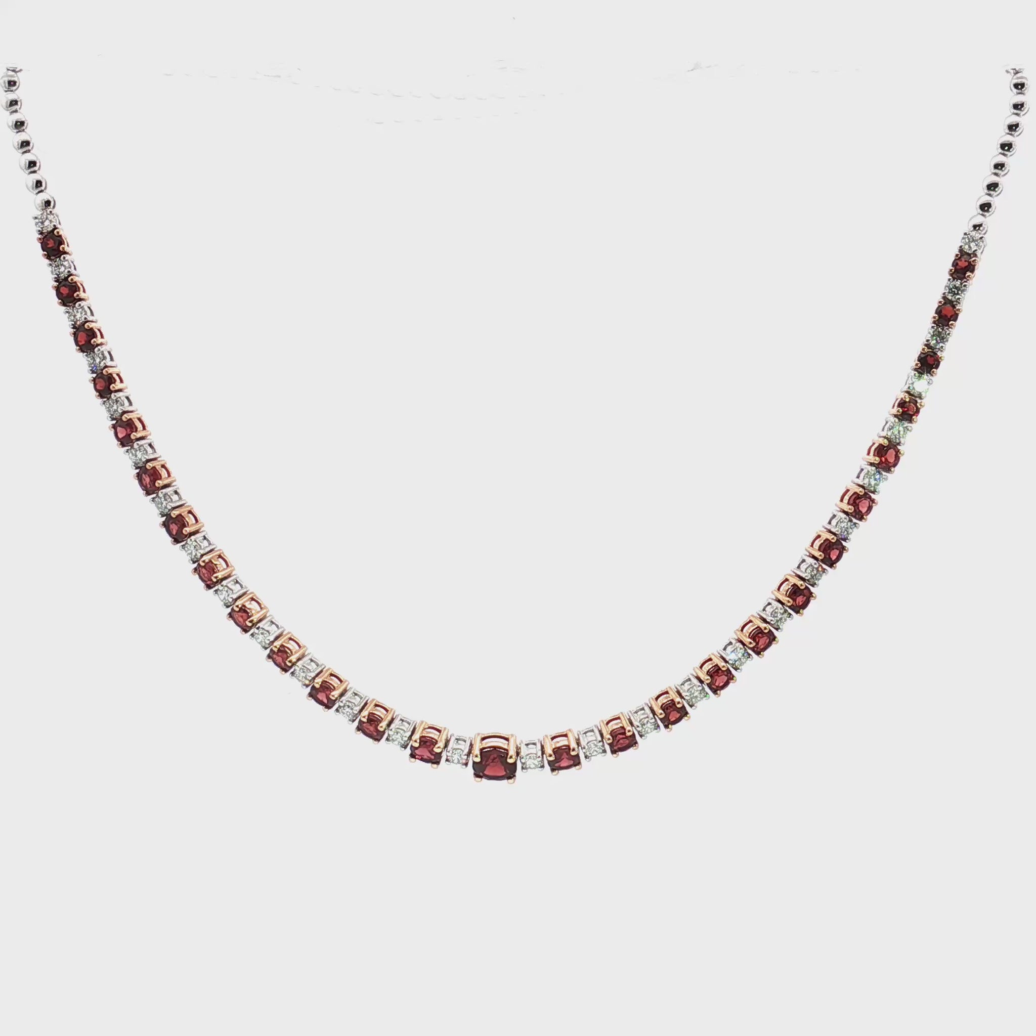 This refined necklace is crafted in 18k white gold, adorned with 6.30 carats of deep garnet rubies alternating with 2.30 carats of round brilliant diamonds. The classic line-style design radiates balance, sophistication, and timeless charm, making it a perfect statement piece for evening elegance or formal occasions.
