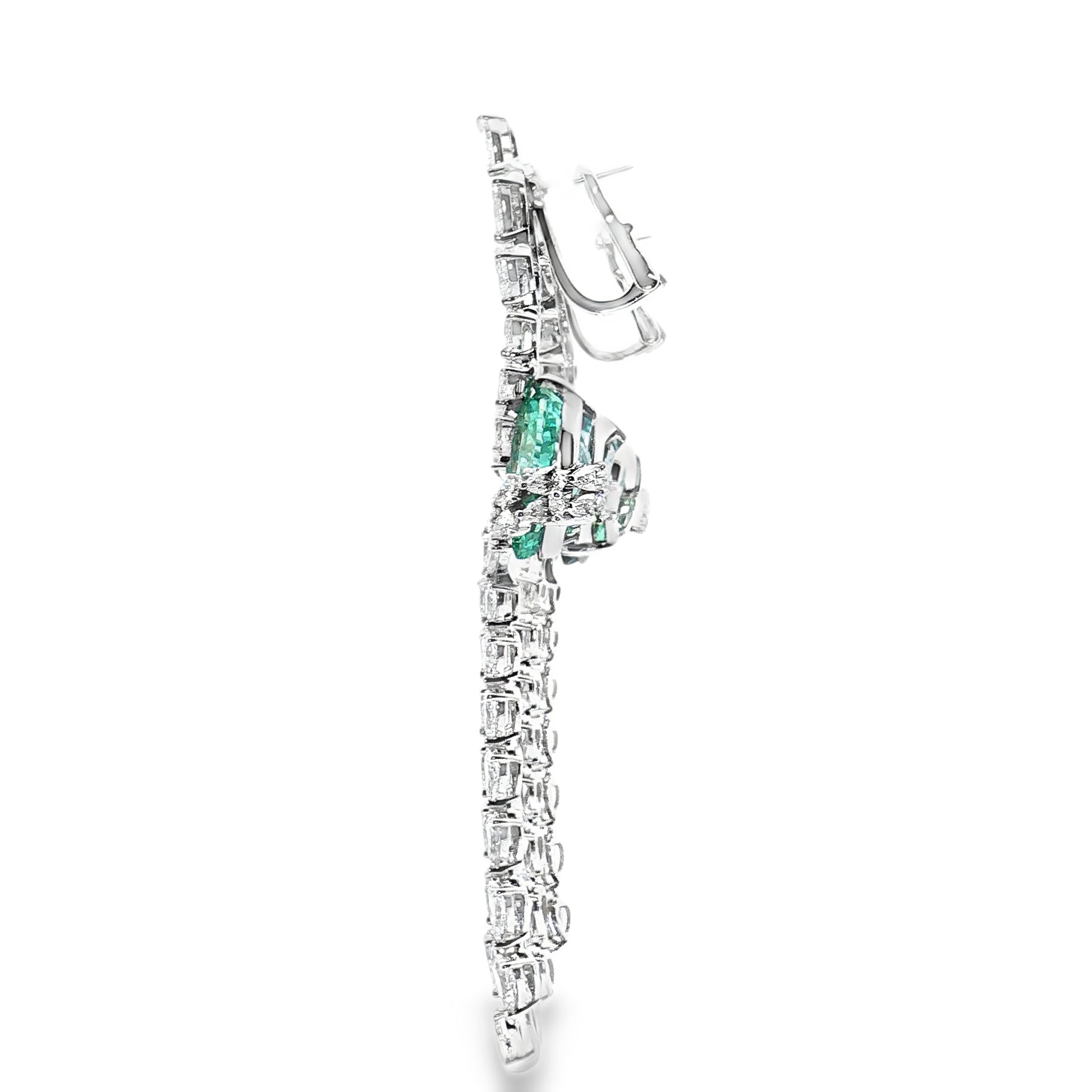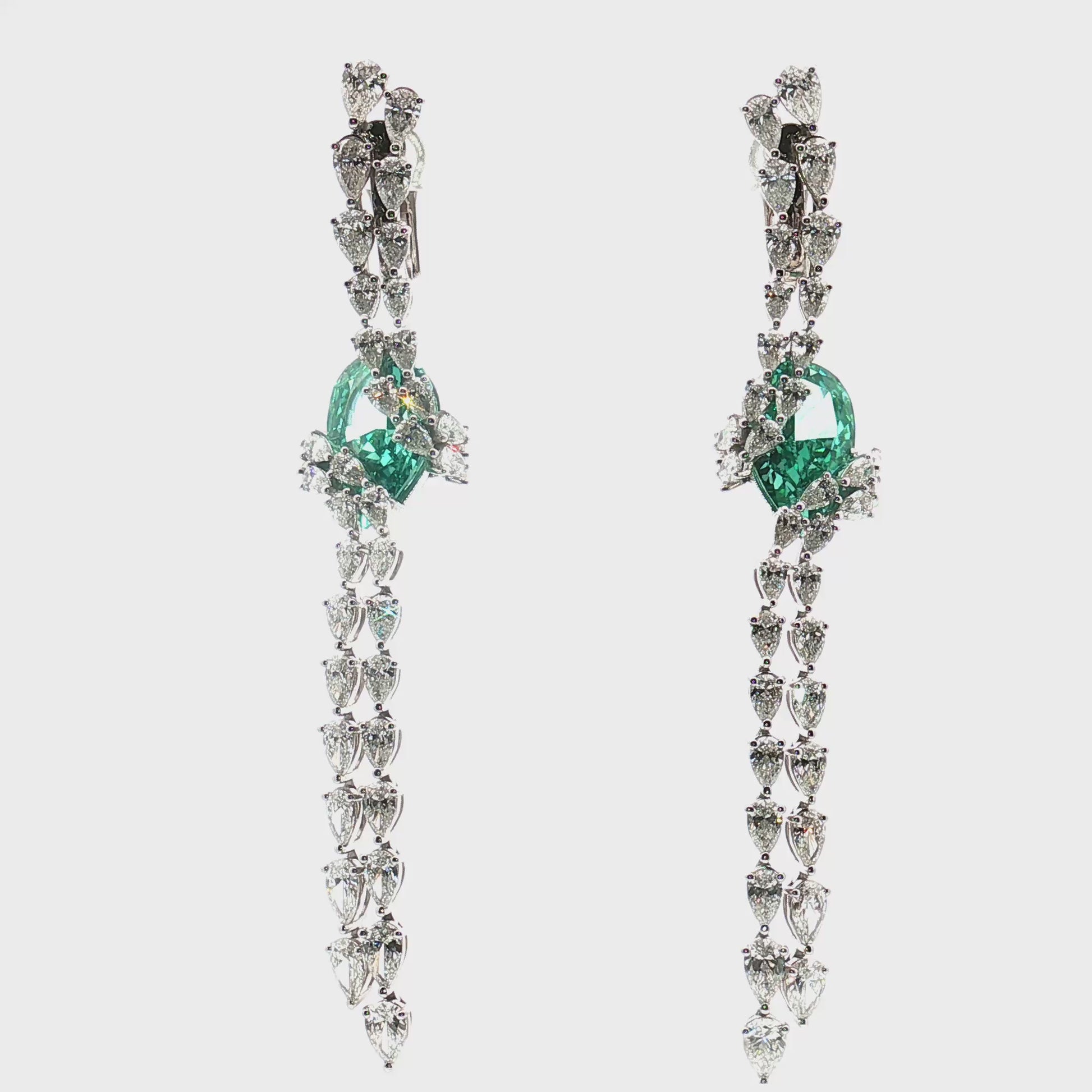 These dramatic drop earrings are crafted in 18k white gold, showcasing a cascade of 11.79 carats of round brilliant CVD diamonds. CVD (Chemical Vapor Deposition) diamonds are real diamonds, created with advanced technology to mirror the brilliance, hardness, and fire of natural diamonds, while being eco-friendly and conflict-free. Accented by bold green simulant gemstones, this design blends modern sustainability with timeless luxury, perfect for high-glamour occasions.