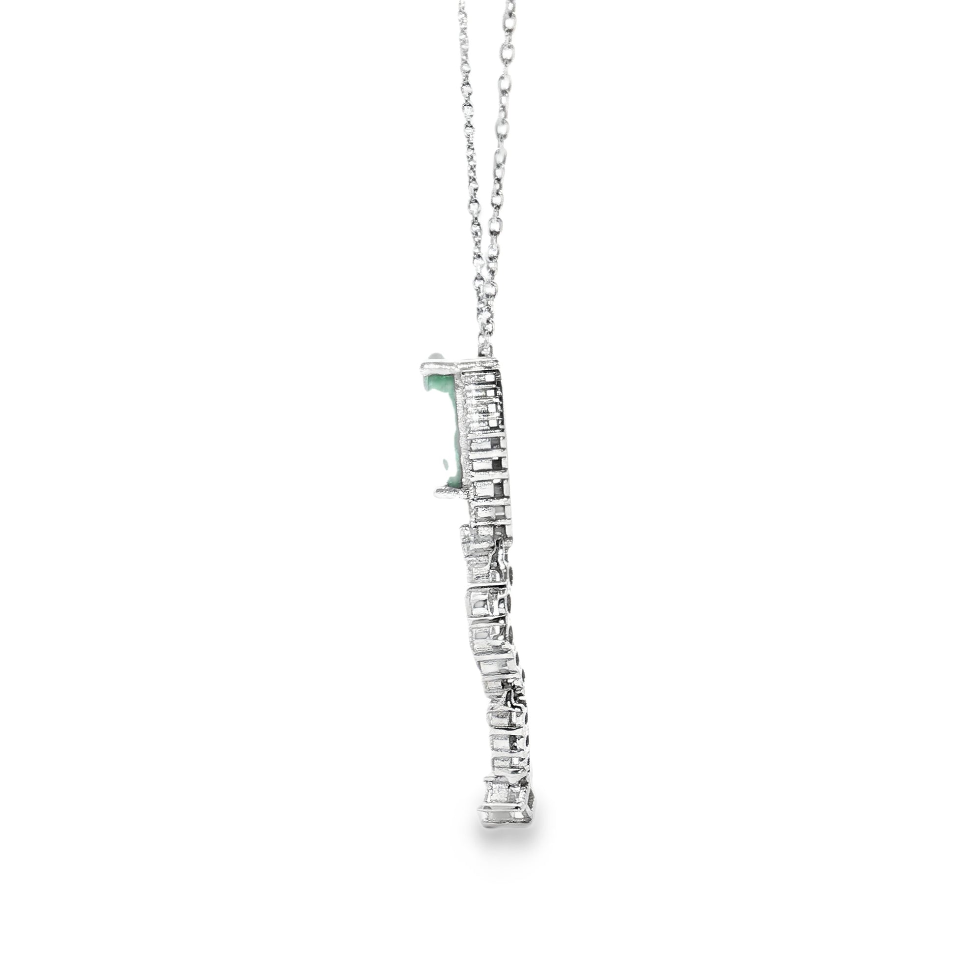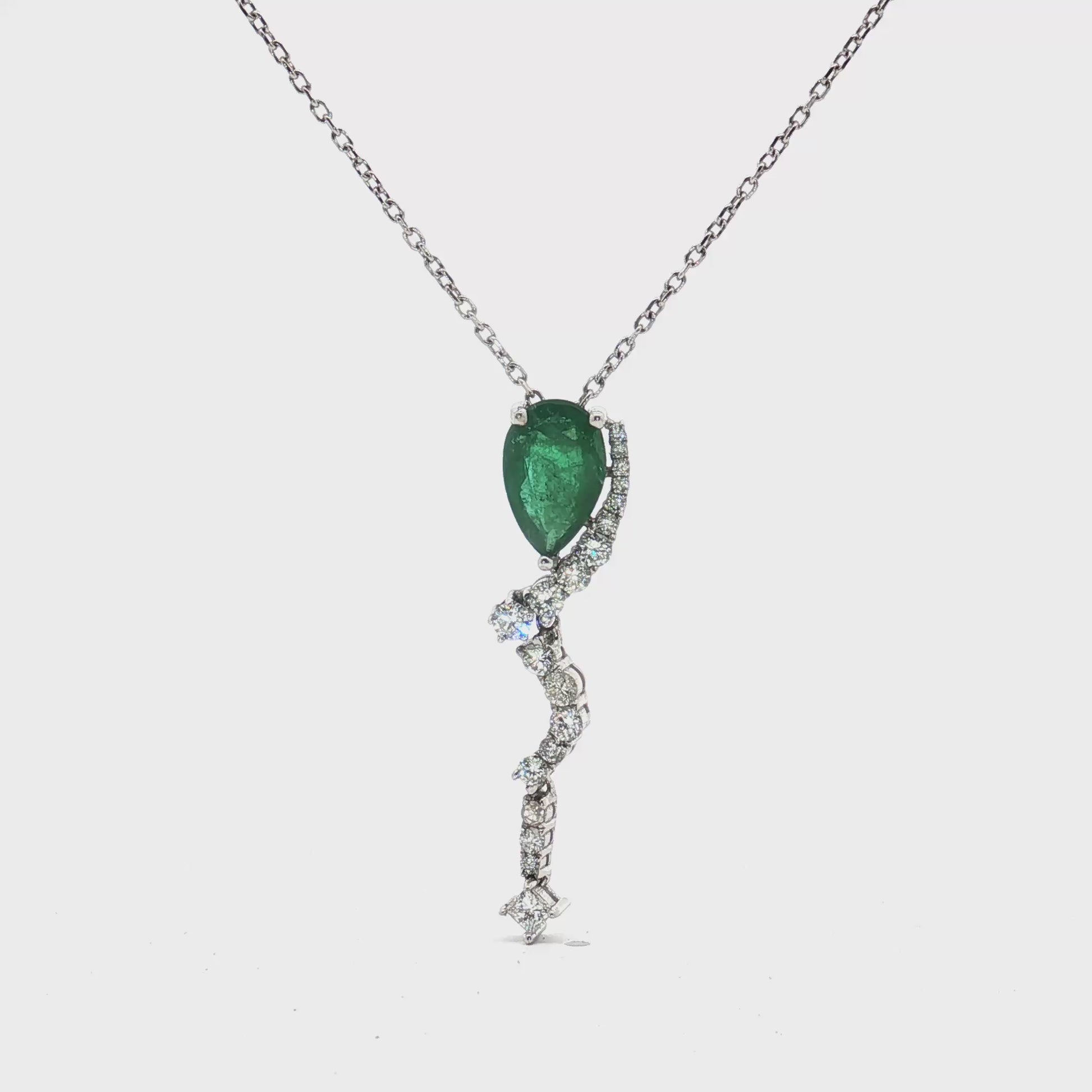Crafted in 18k white gold, this elegant necklace features a vivid 1.13 carat pear-shaped emerald, gracefully accented with cascading round brilliant diamonds totaling 0.365 carats. The flowing design evokes natural elegance, combining the lush green of emerald with the timeless brilliance of diamonds. A refined jewel that embodies sophistication and modern luxury.