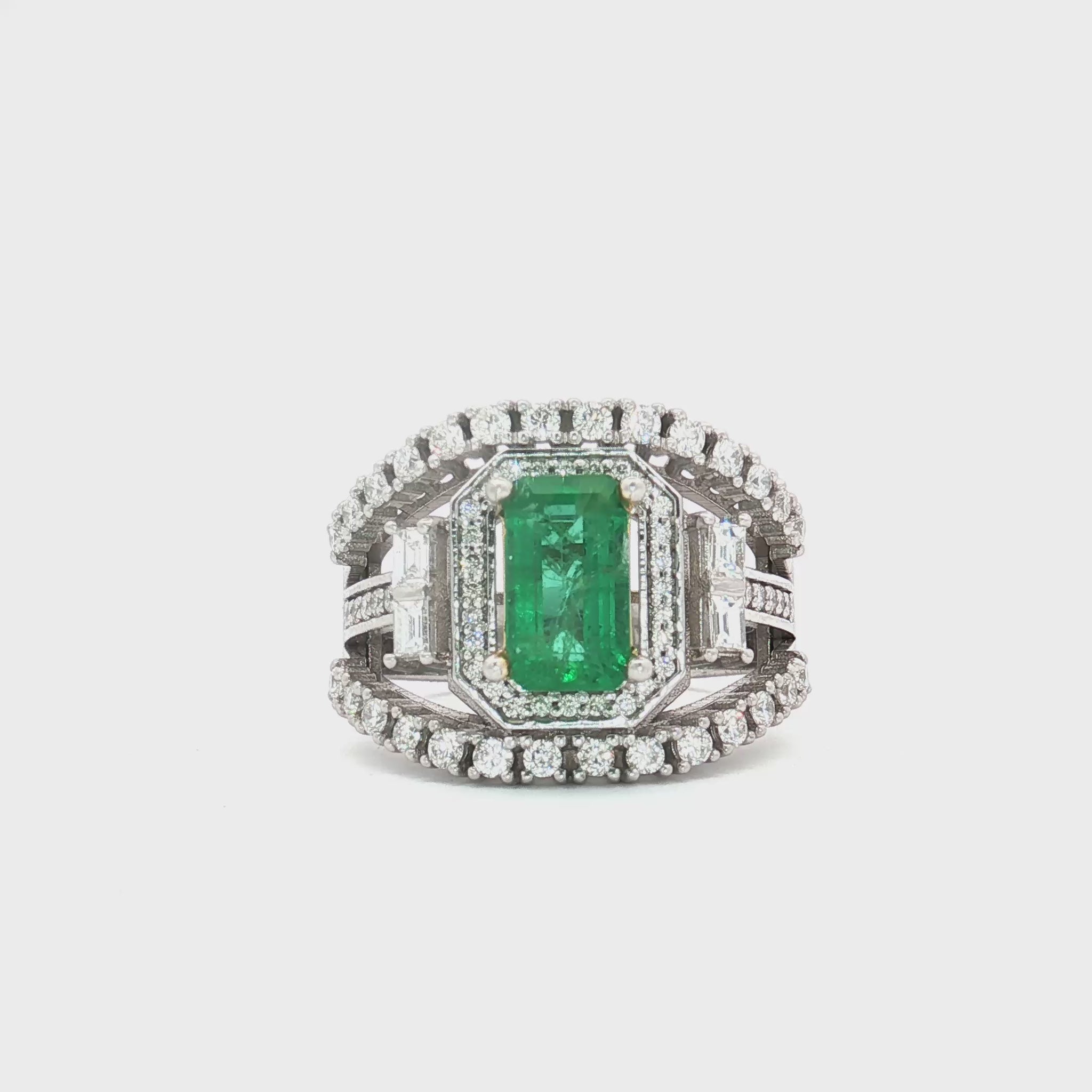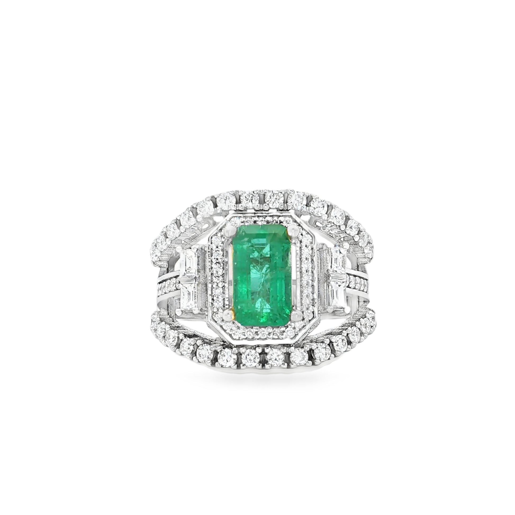This regal ring is crafted in 18k white gold, showcasing a vivid 1.65 carat emerald framed by a double halo of round and baguette diamonds. With a total diamond weight of 0.895 carats, the design radiates brilliance and sophistication, elevating the emerald’s natural beauty. A statement piece that embodies timeless elegance and royal allure.