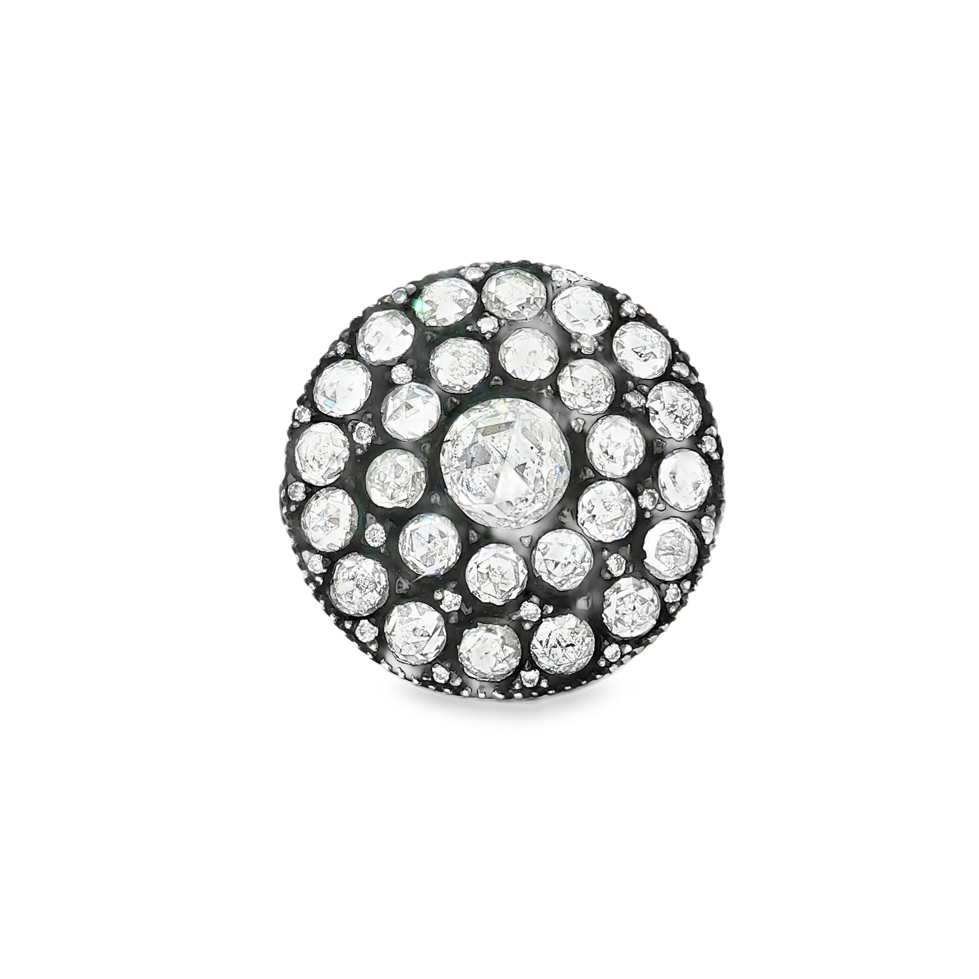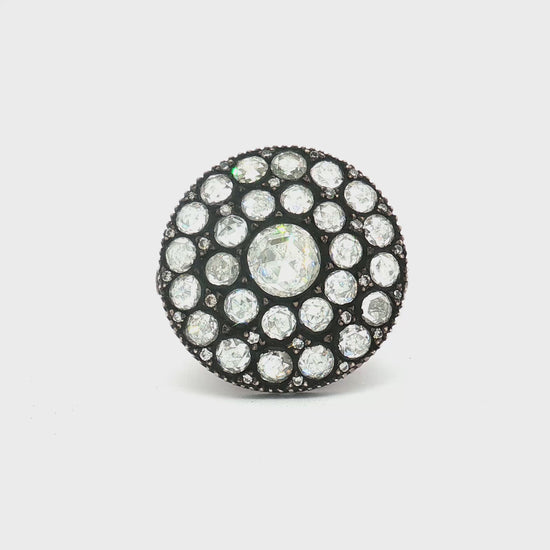 This striking statement ring is crafted from 18k gold with artisanal oxidized detailing, evoking a vintage yet timeless allure. At its center shines a 0.62 carat diamond, encircled by an intricate constellation of 4.09 carats of diamonds in varying sizes. The bold circular design radiates brilliance from every angle, blending artistry with luxury for a one-of-a-kind jewel.