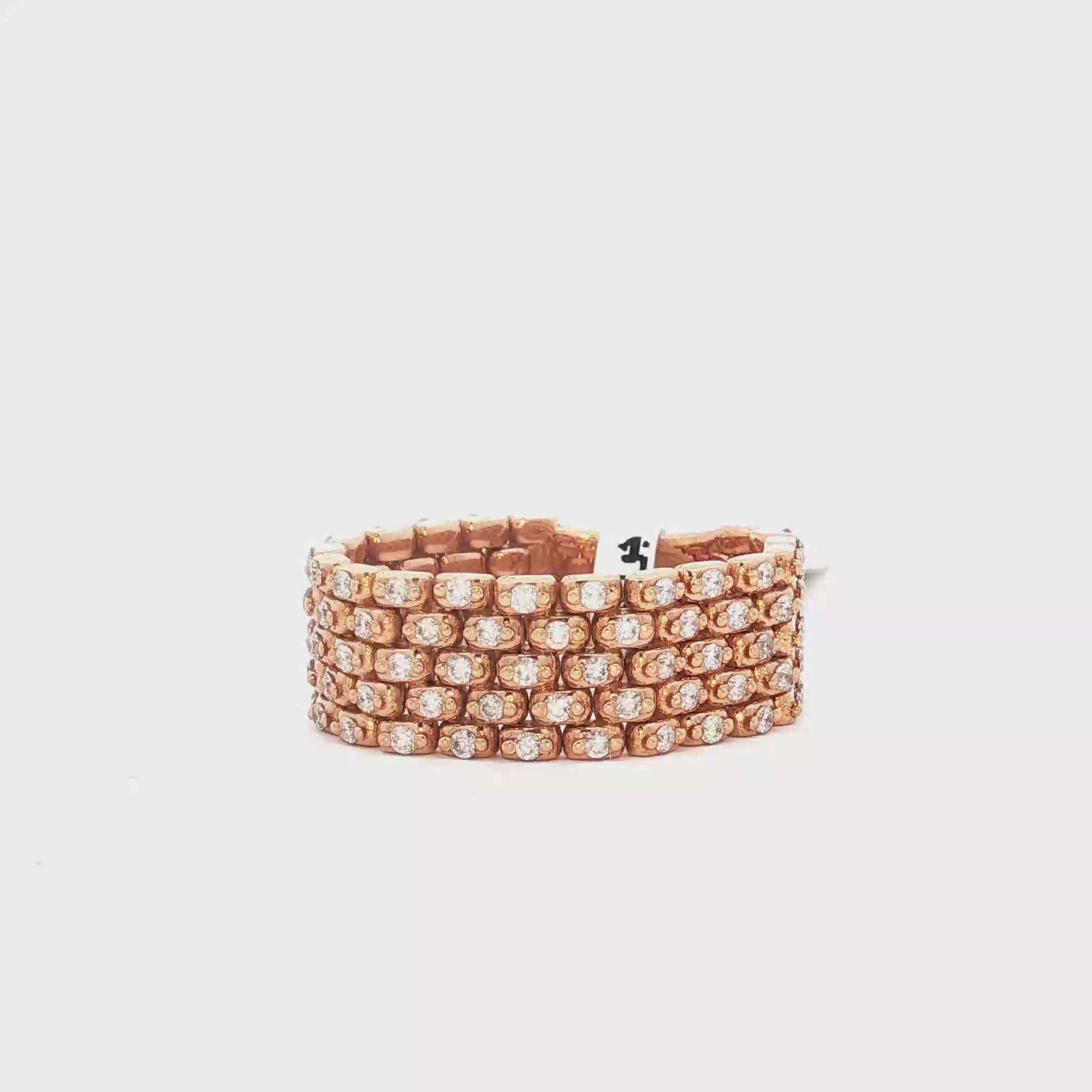 Crafted in elegant rose gold and weighing 8.81g, this bold ring is set with 0.75ct round brilliant diamonds across multiple rows. Its flexible, luxurious design offers both comfort and a dazzling statement look.