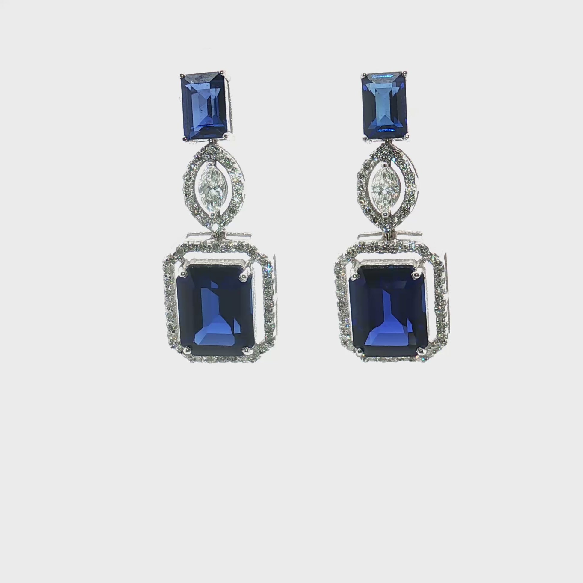 These exquisite earrings are crafted in 18k white gold, featuring a dazzling combination of round and marquise diamonds paired with striking simulated blue rubies. With a total weight of 8.16 carats, the rich midnight-blue gemstones radiate regal charm, enhanced by the brilliance of diamonds. Designed as part of the Royal Midnight Collection, these earrings complete the look of timeless luxury.